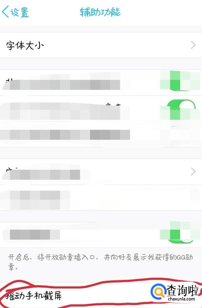 第四种就是在手机QQ里面,点击设置-辅助功能,则会出现“摇动手机截屏”的字样,点击开启,那么在摇动手机时,则会进行截屏。
