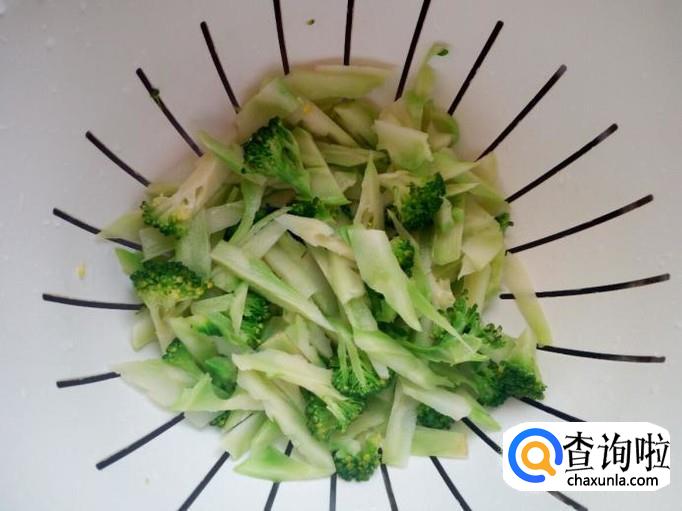 西兰花菜根用水清洗干净,控干水分,切成片。