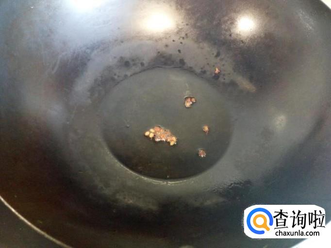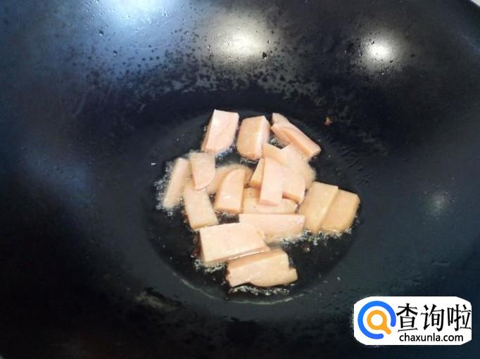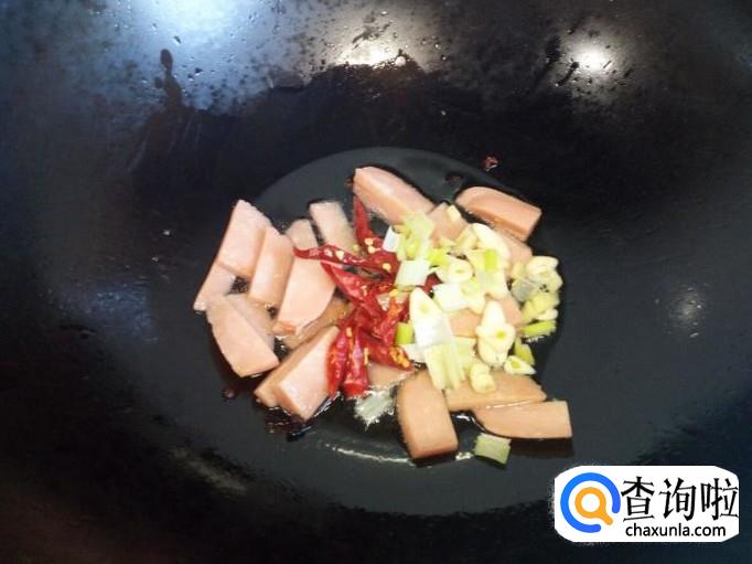 锅里放入油加热,油热后放入花椒爆锅。放入火腿肠小火翻炒。