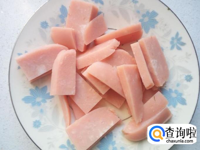 火腿肠去除外包装,用刀切成片。