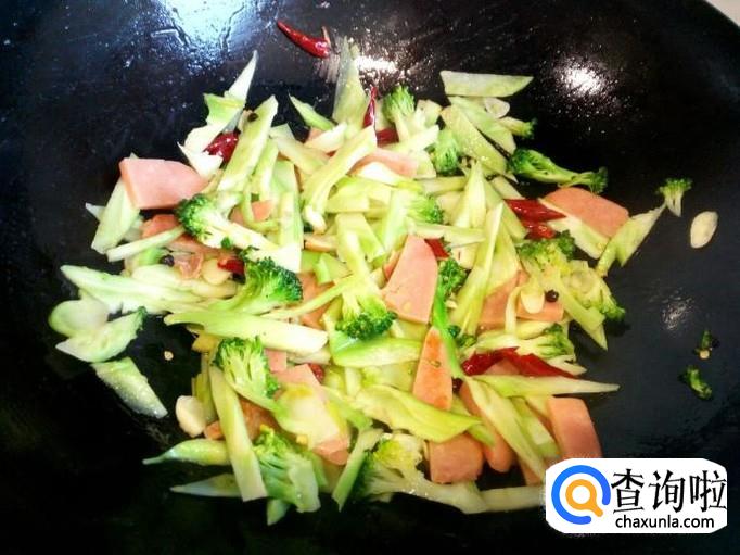 炒至火腿肠变软,放入料酒,红干椒,葱,姜,蒜,翻炒。随即放入西兰花菜根,转大火快速翻炒,放入一小匙儿蚝油,盐。