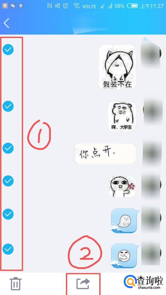 然后页面就会变成下图这样,然后我们先在左边勾选需要转发的聊天记录,再在下面找到一个转发的图案,点击打开。
