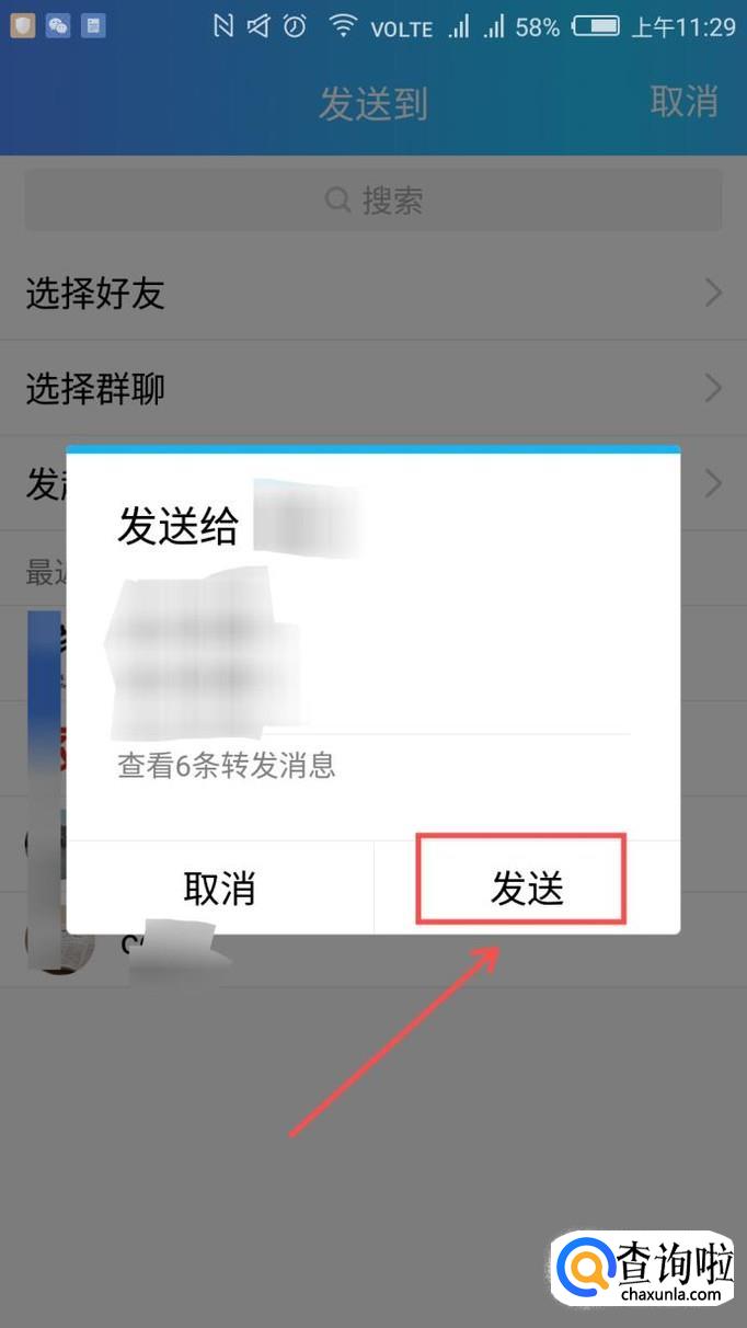 选择你要发送的好友,会弹出一个对话框,然后点击对话框中的“发送”。