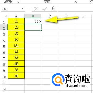 接着,按下回车键,得到结果:110;接着,鼠标放在B1单元格右下角这里,如图所示。
