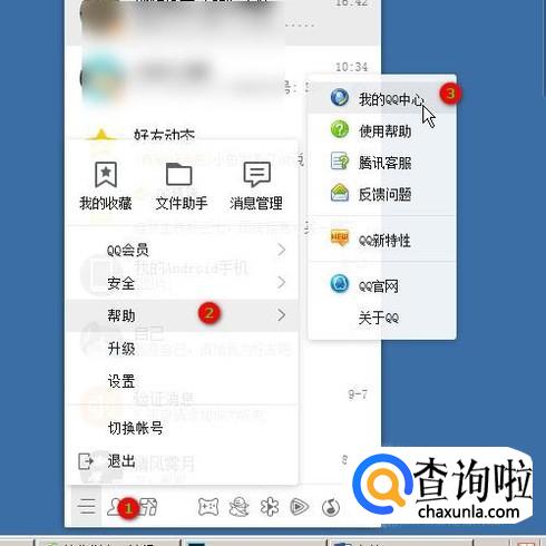鼠标放在“帮助”这里,右侧弹出子菜单,再点:我的QQ中心