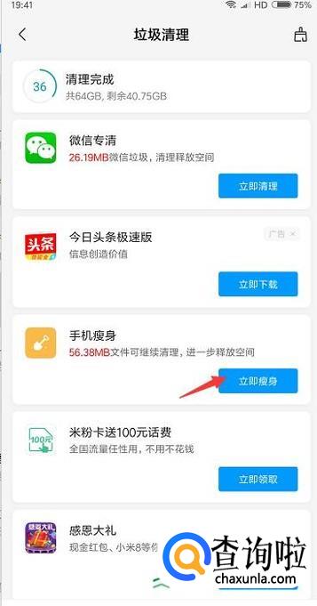 垃圾清理完成后下面会有一个手机瘦身的选项,点击一下。