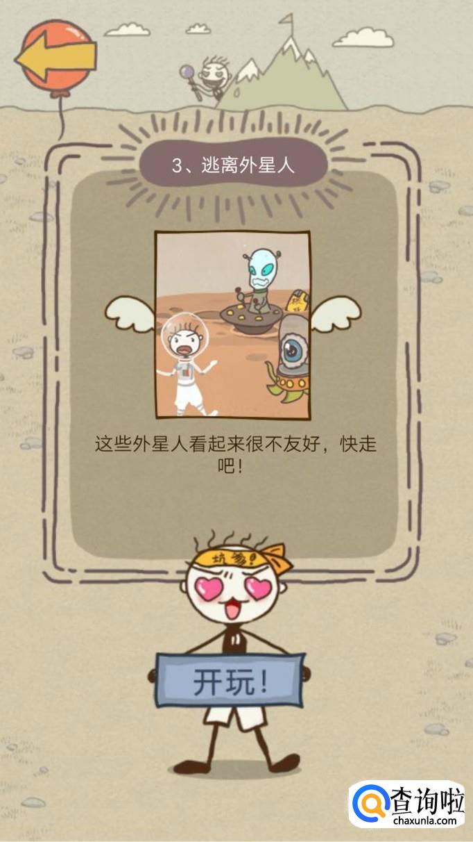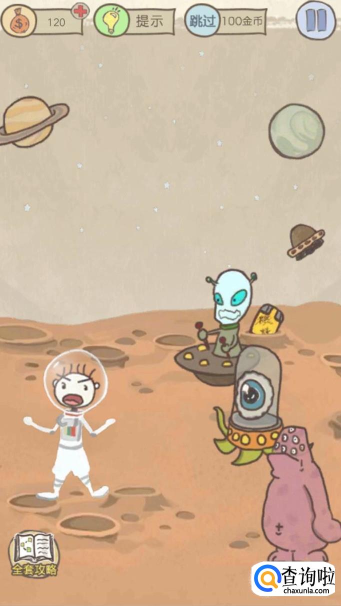 第三关:首先从左向右滑手机,就会从左边出来一个火箭,然后将外星人后面的燃料移到火箭上,史小坑就可以乘坐火箭逃走了。