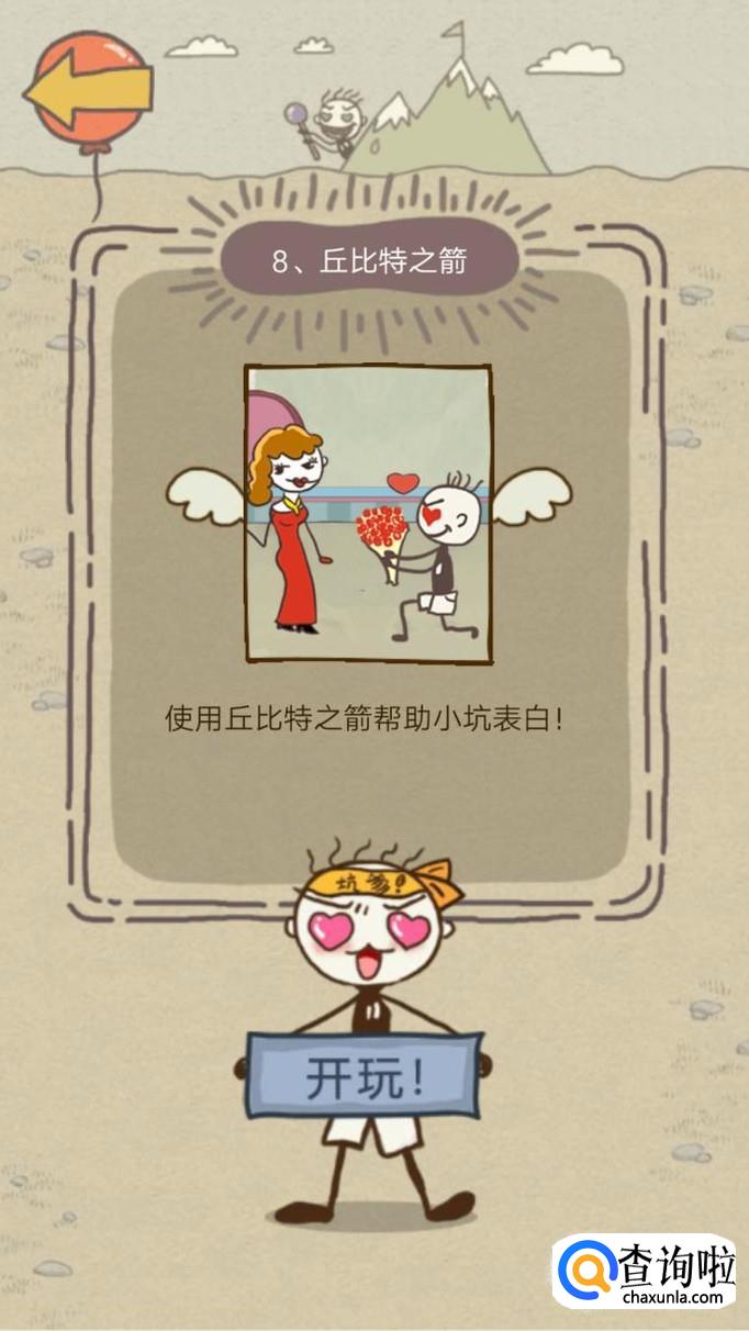 第八关:将史小坑与女神中间的爱心移到丘比特的箭上,然后点击女神,箭就会射出去,女神和史小坑就会相爱。