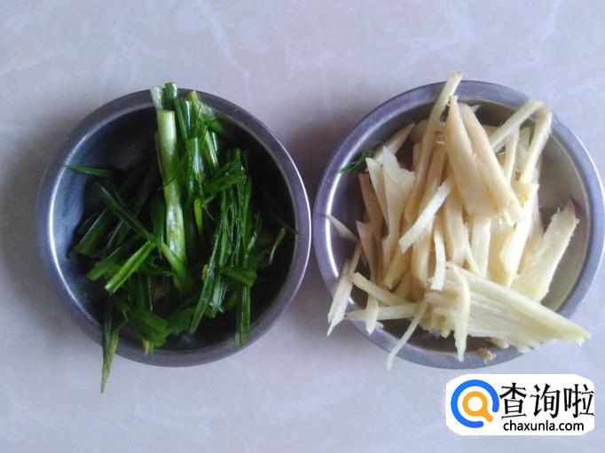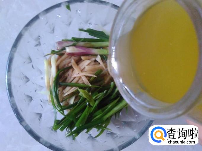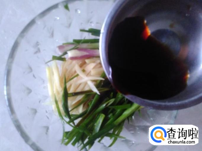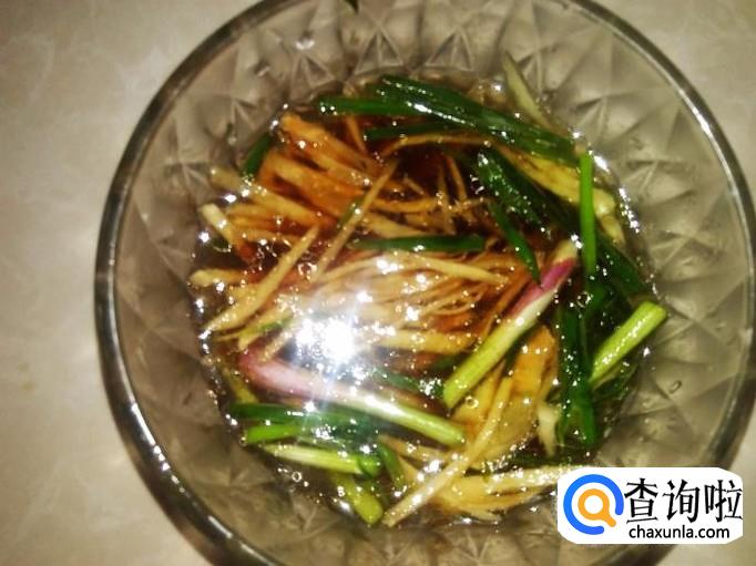 做调料,用嫩姜去皮切成小丝,香葱也切成小丝,放到碗里,加1勺生抽。