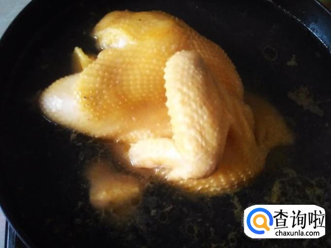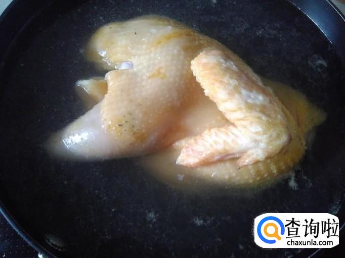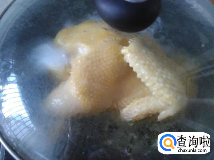 锅装适量的水煮沸,然后放土鸡进去,水量最好没过土鸡。