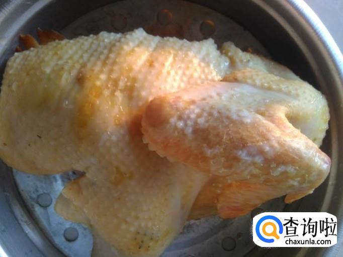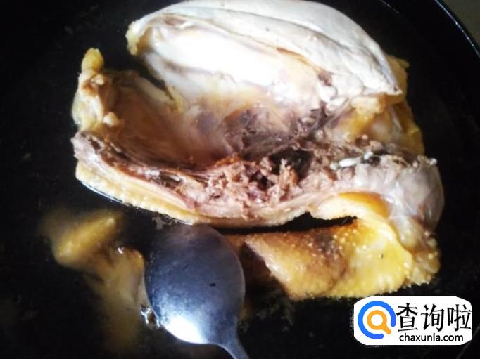 打开盖子把鸡翻转过来,再盖上盖子从新煮沸,煮沸后再煮2分钟熄火,然后焗10分钟左右,打开盖子用筷子插到鸡身底下,然后拔出筷子,插筷子那个洞没有冒出血水来就是熟透了。
