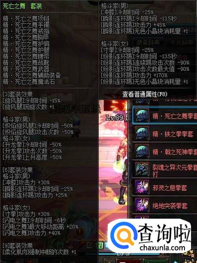戟之死神套装,着重对【闪电之舞】和【瞬影连环踢】这两个技能的冷却时间进行了缩减,并提升了这两个技能的攻击力。