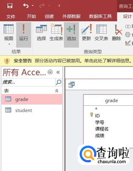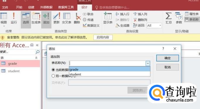 然后在【设计】下面的【查询类型】点击【追加】,会弹出一个对话框,选择要追加的表。