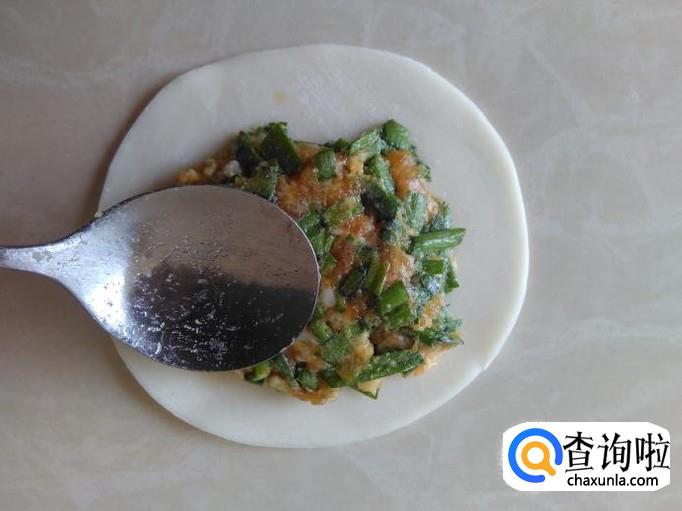 把肉馅装到饺子皮中间,然后用勺子压实。