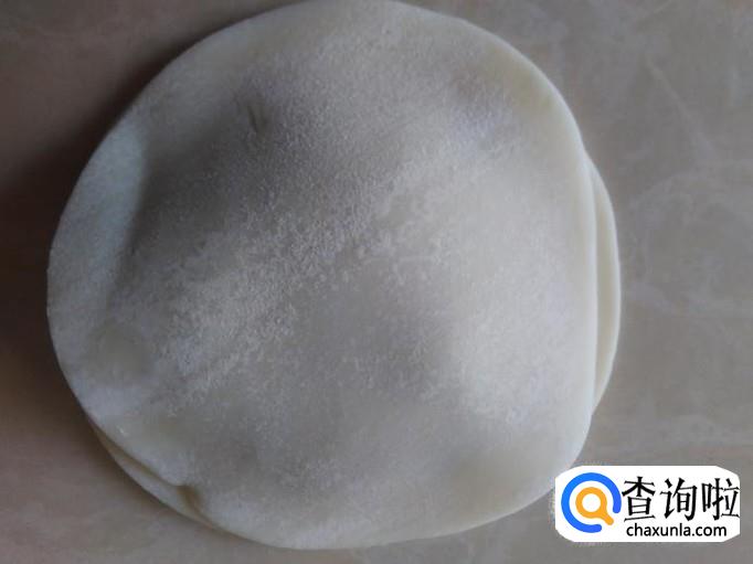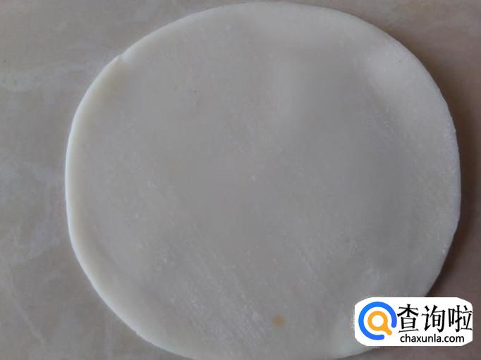 拿一块饺子皮摆在台板上。