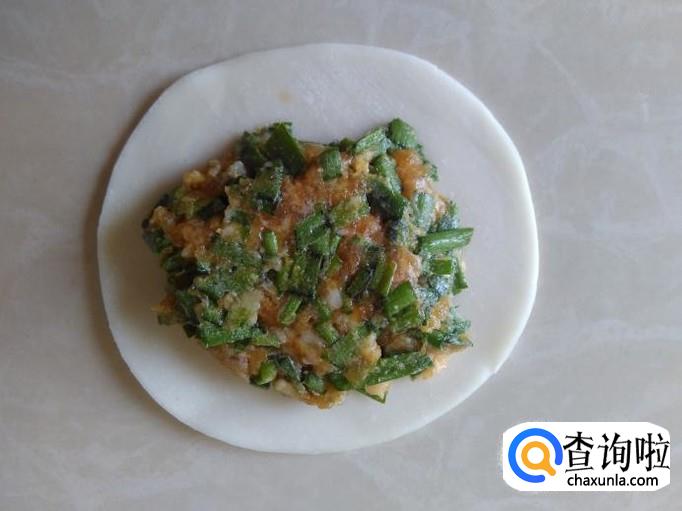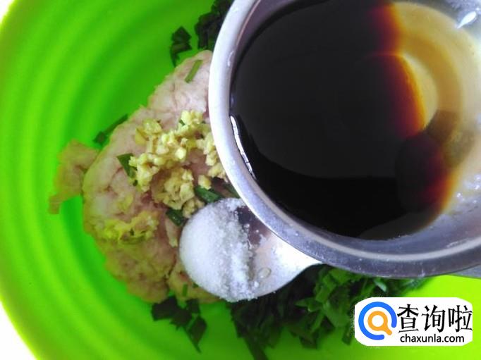 猪肉剁成肉末,加适量的盐、韭菜末、姜蓉。