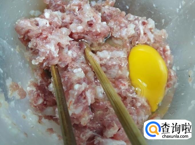 取一个鸡蛋,然后敲到之前做的馅料中,用筷子拌匀。