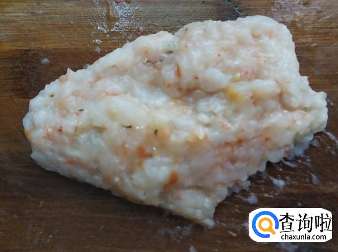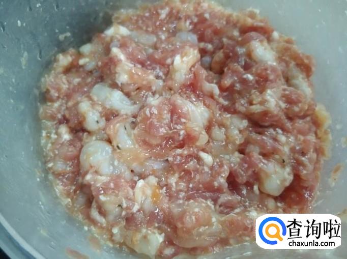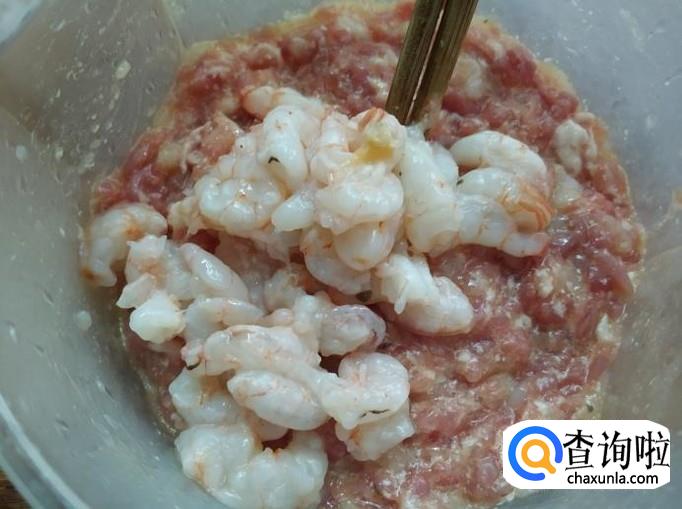 最后将之前保持完整的整个虾放入馅料中,用筷子拌匀。