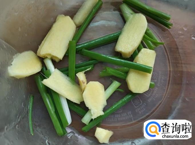 将姜清洗干净,然后切成姜片,备用。将葱清洗干净,然后切成3厘米左右的长段,备用。