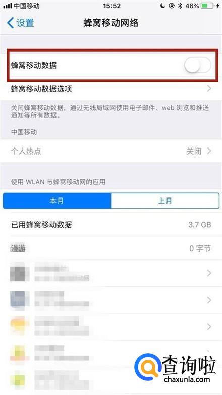 接着点击开启蜂窝移动数据开关,如下图所示。
