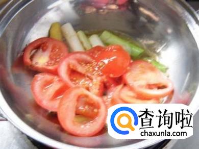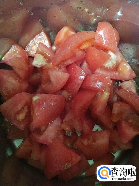 蒋番茄切成一片一片的,将葱切成一段一段的,把猪油炒化后倒入番茄和葱翻炒