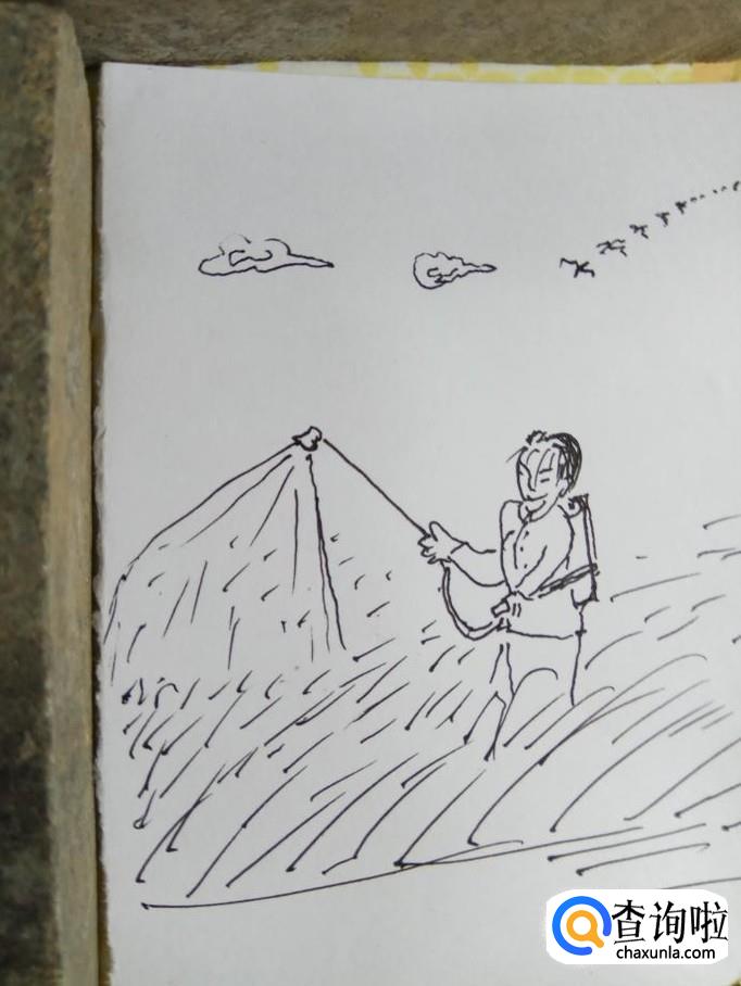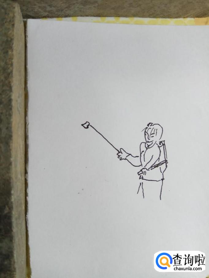 再用两条平行线画出这个人手上拿着的喷雾器,喷雾器的头儿是有点儿像扇形的。