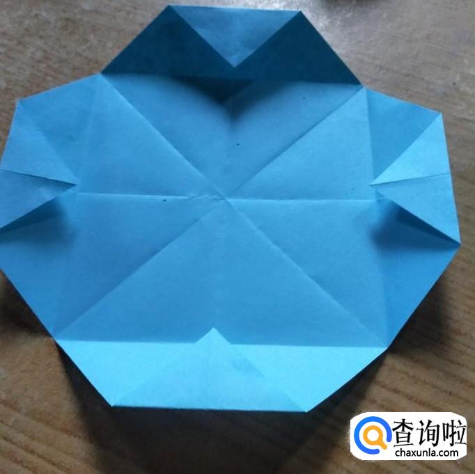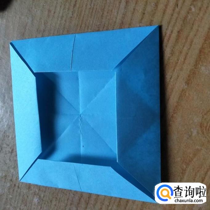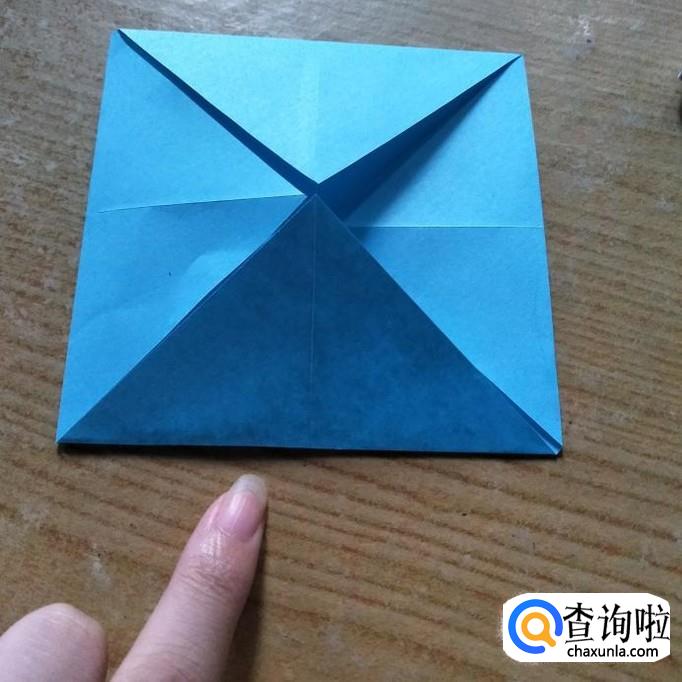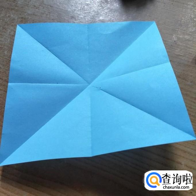 选择一张7x7cm的手工折纸,角于角对折,边与边对着,形成如下图一所示的折痕。然后我们使四个顶点与中点重合,如下图2所示。