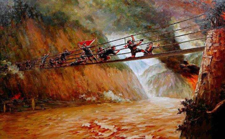 泸定桥离水面高约30丈,由13根铁索组成。泸定桥又名大渡桥,是中国四川省甘孜藏族自治州泸定县泸桥镇境内的一座跨大渡河铁索桥,因“飞夺泸定桥”战斗而闻名中外。