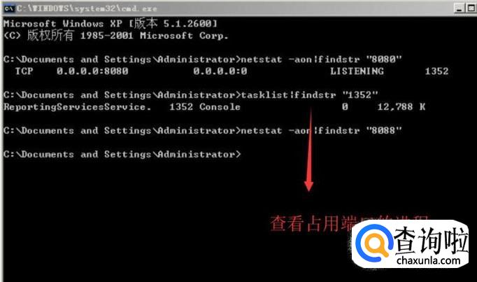 接下来我们在cmd命令行中用netstat以及tasklist命令查看占用端口的进程,如下图所示