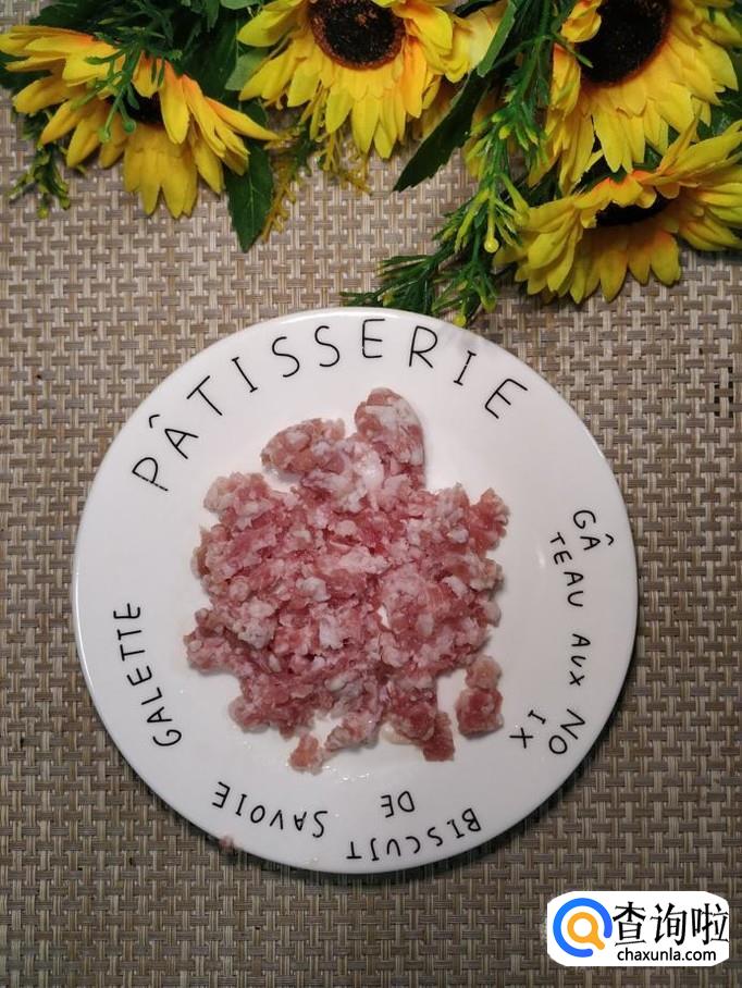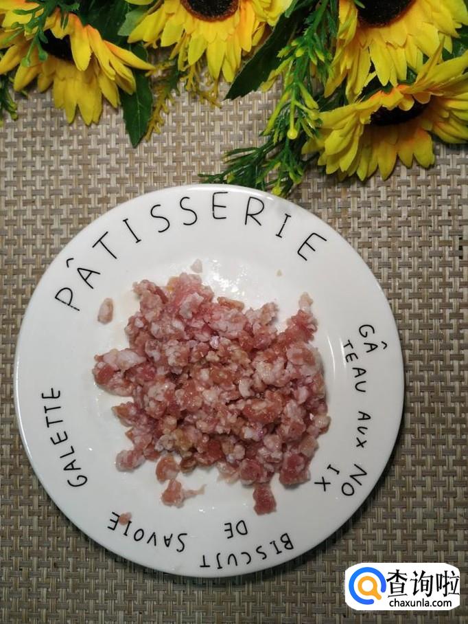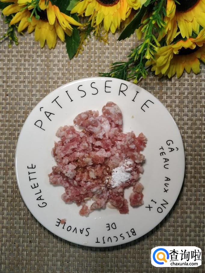 准备适量猪肉,洗净后剁碎,加入适量盐,鸡精,五香粉,生抽,料酒,淀粉,搅拌均匀,腌制十分钟。