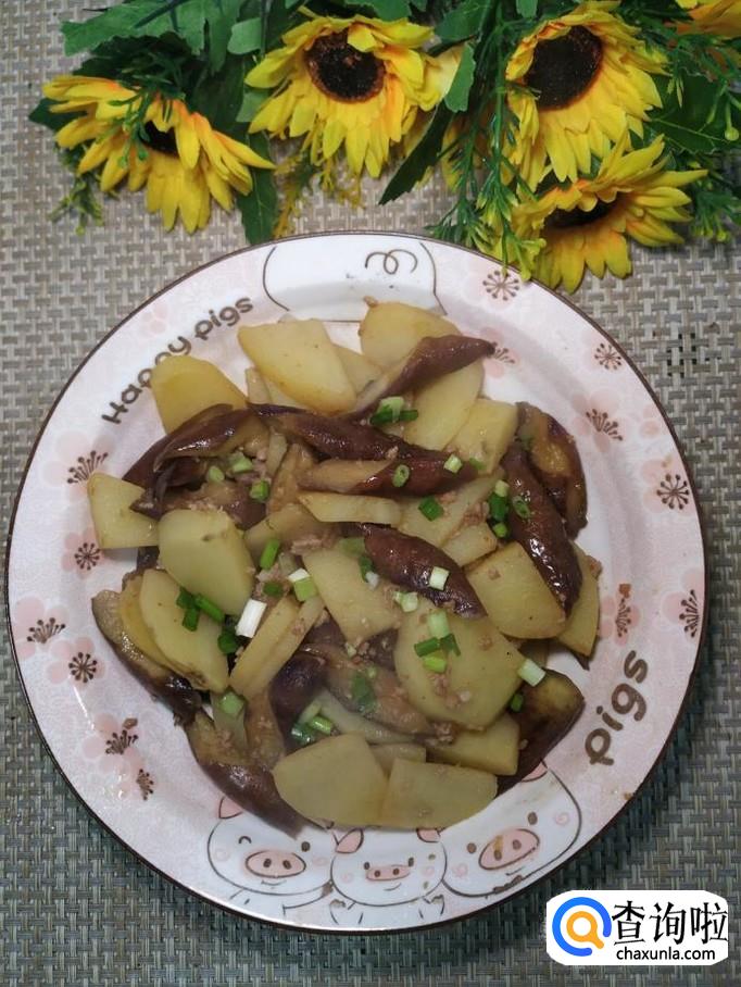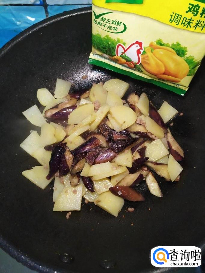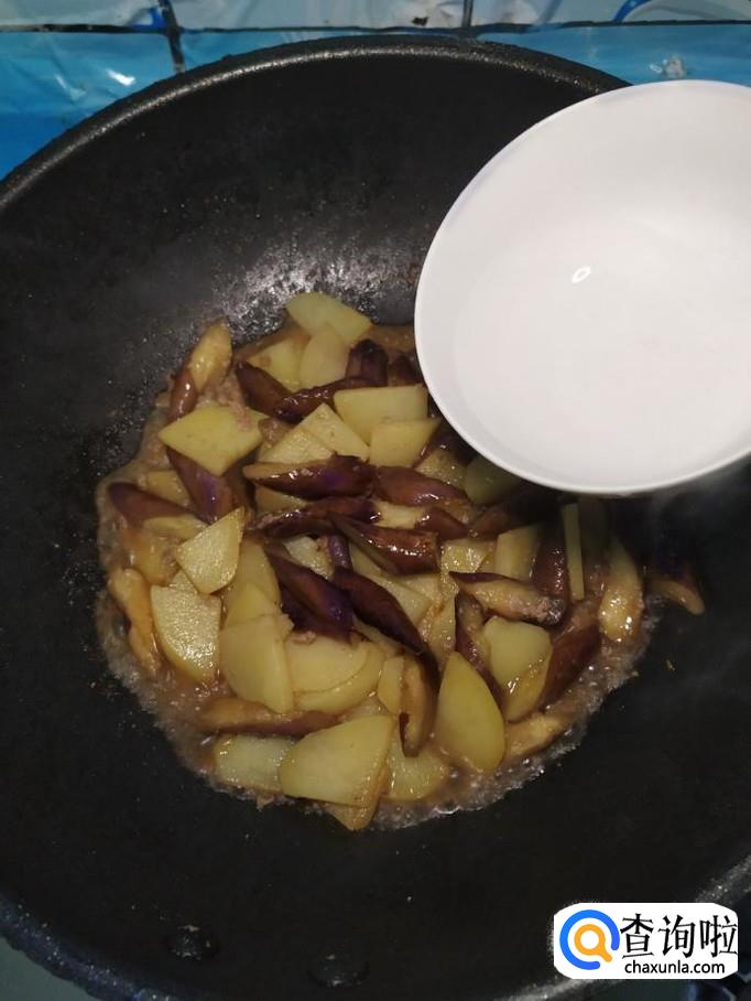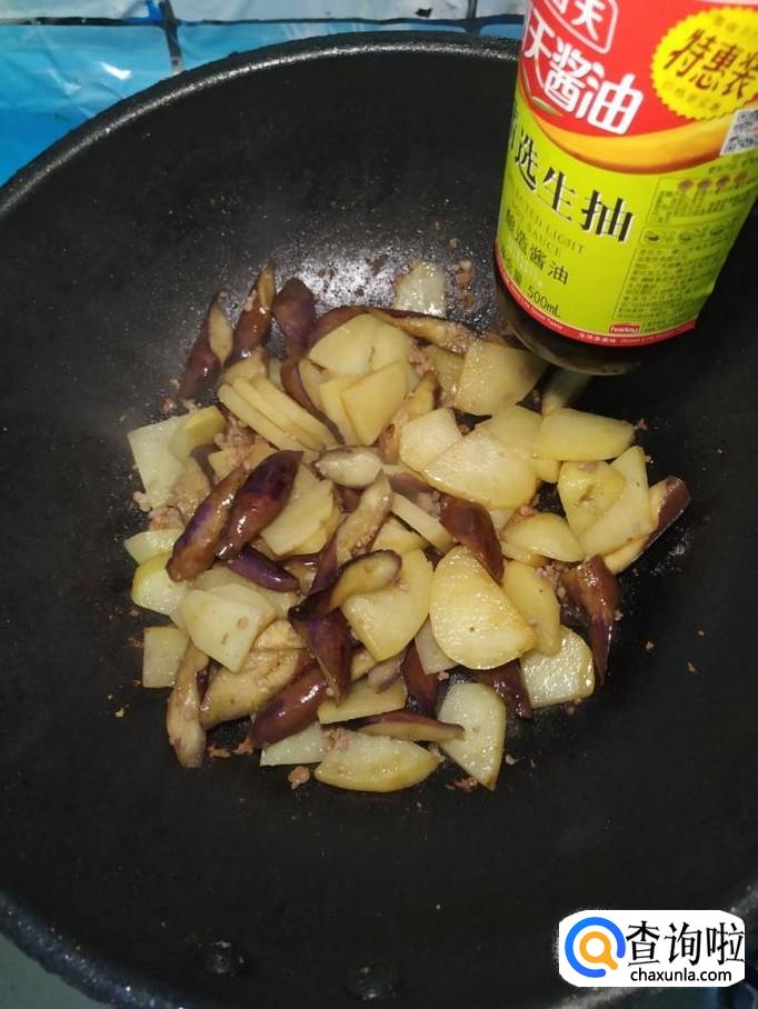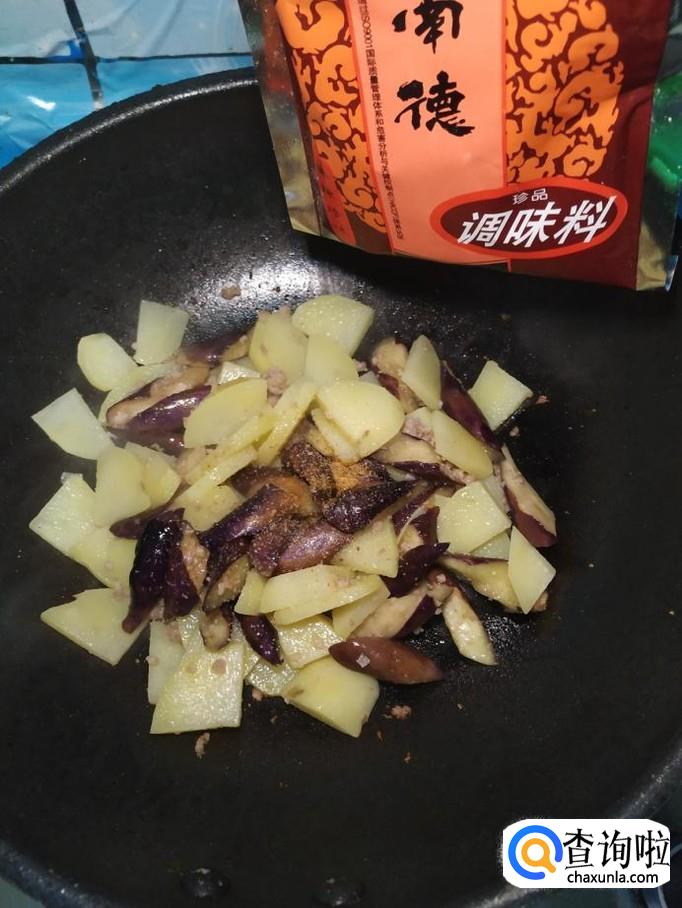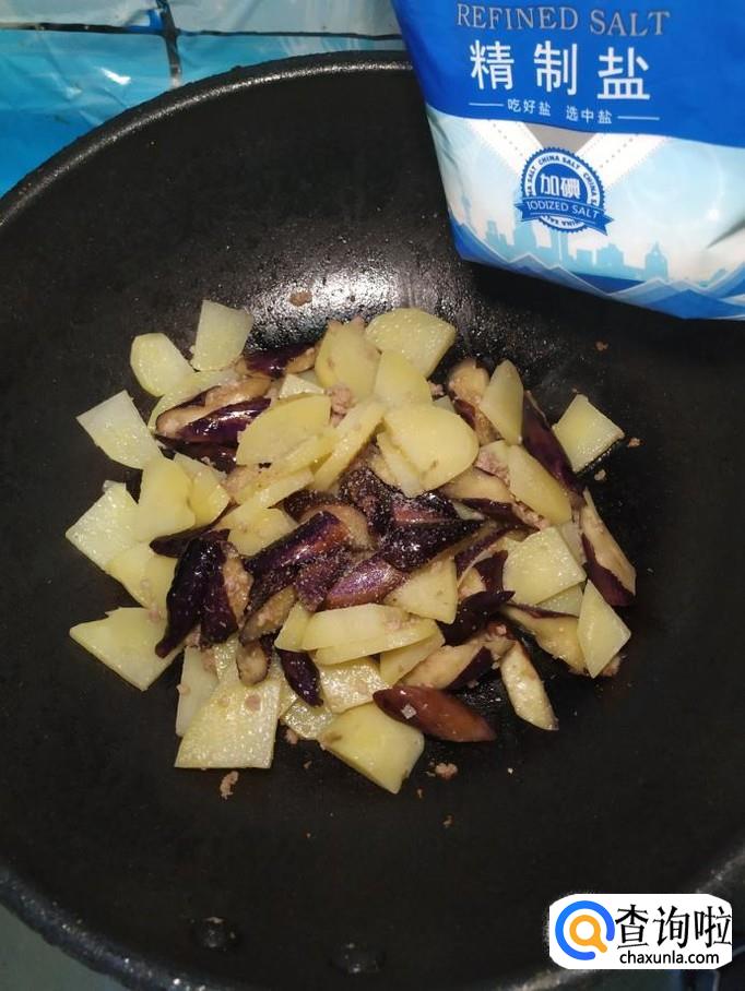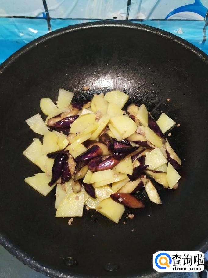 将准备好的土豆倒入锅中,和茄子一起翻炒均匀。