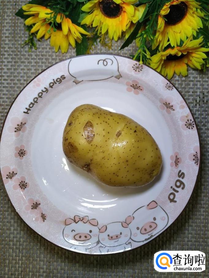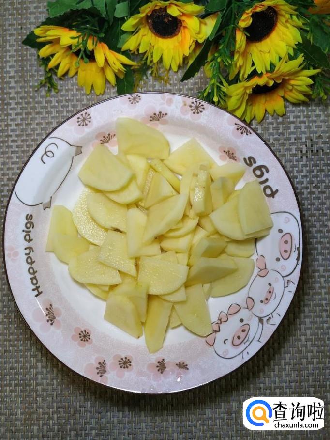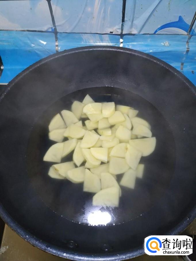 准备适量土豆,洗净去皮后,切成片,洗去淀粉,放入锅中焯水,焯至八成熟,捞出备用。