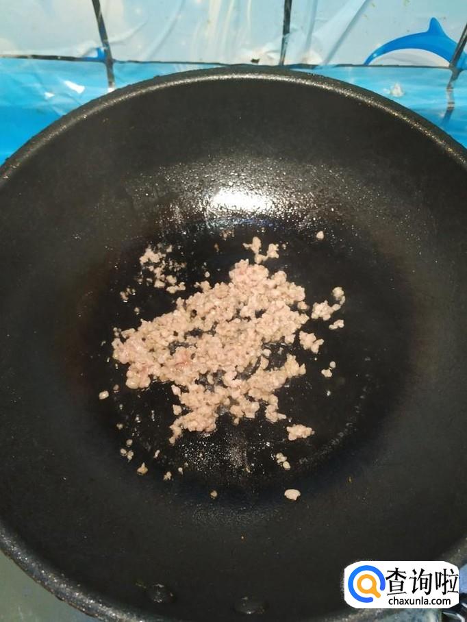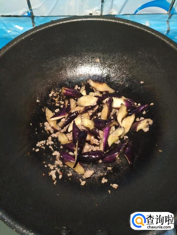 炒锅中放入适量油,油热后将肉末倒入锅中炒香,然后将茄子倒入锅中,翻炒均匀。