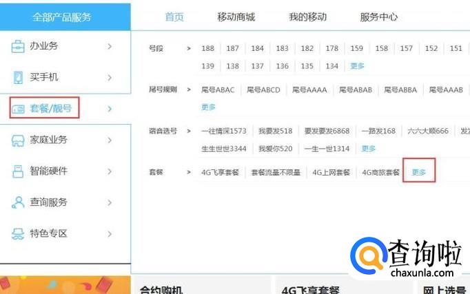 登陆成功之后,在官网首页面,点击“套餐/靓号”菜单选项,并在页面右侧,点击“更多套餐”按钮。