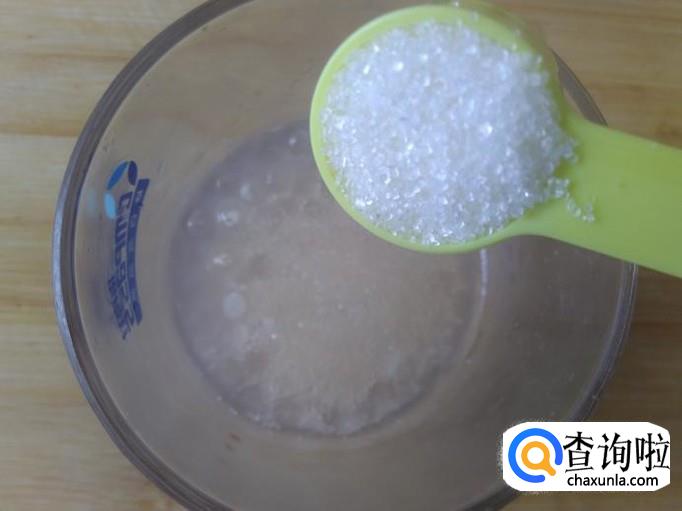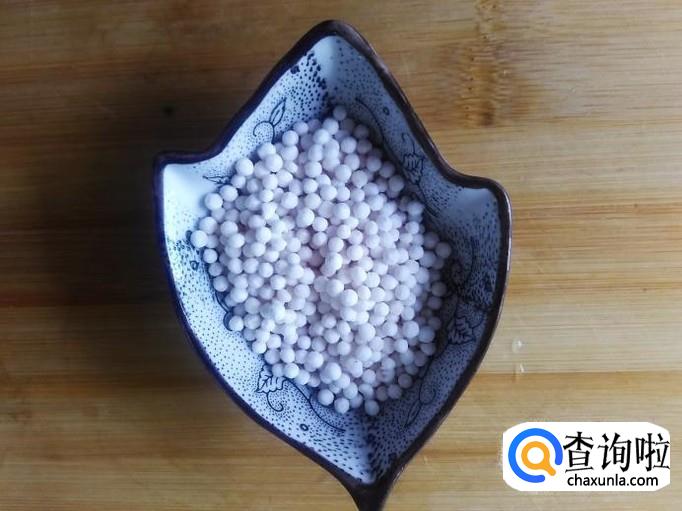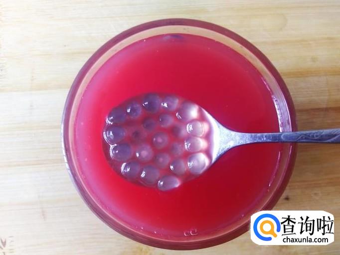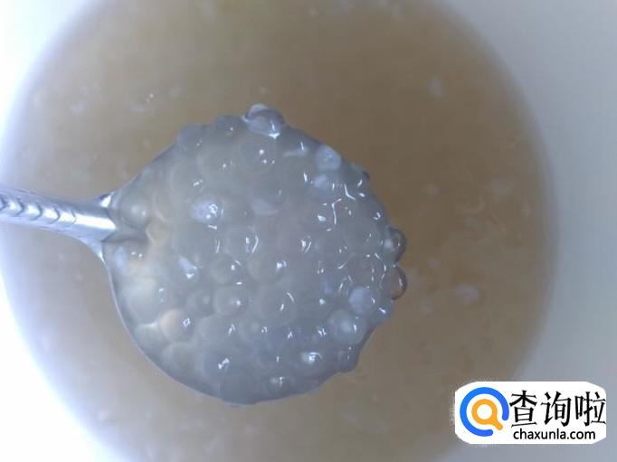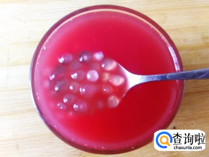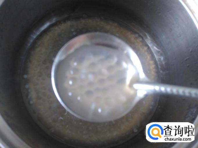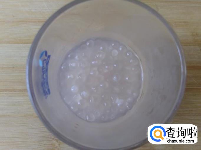 4个小时后拿出来,用勺子装适量的西米露到杯子加适量的白糖。
