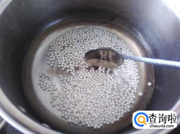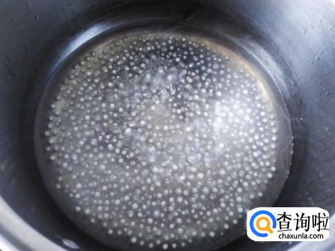 锅里装适量的水煮沸,然后放西米进去,用勺子搅拌一下不给粘锅。