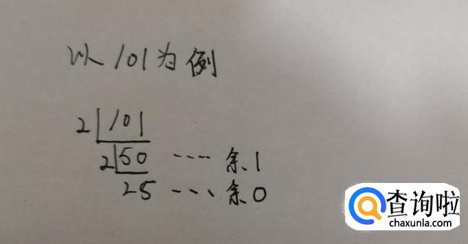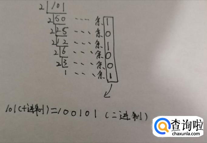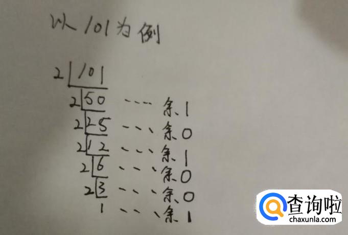 最后可以看到总共有6个余数,分别为1、0、1、0、0、1,把所有的余数从下往上排列即可得到101的二进制数100101