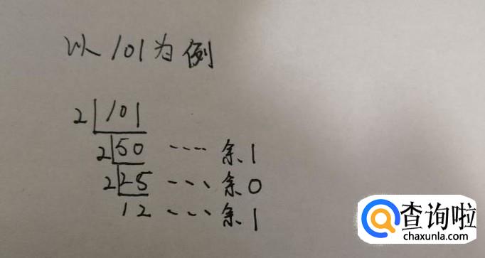 首先我们以十进制的数字101为例,通过短除法,把2当做除数,用101除于2,可以得到商为50,同时得到余数1