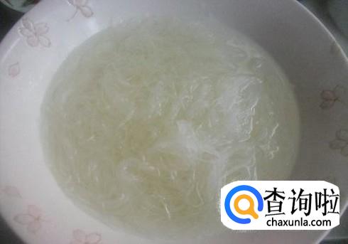 将用凉水泡软的粉丝捞出,平铺在盘子中。