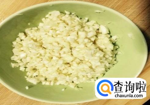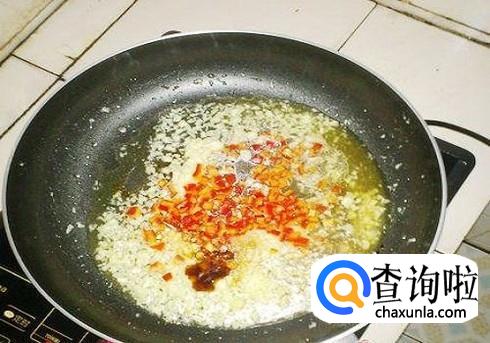 首先将炒锅烧热,放入少许色拉油。然后将切成末的大蒜放入锅中,小火煸炒至大蒜微黄。