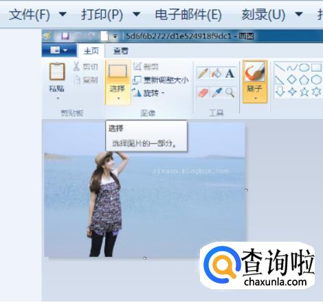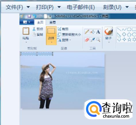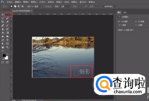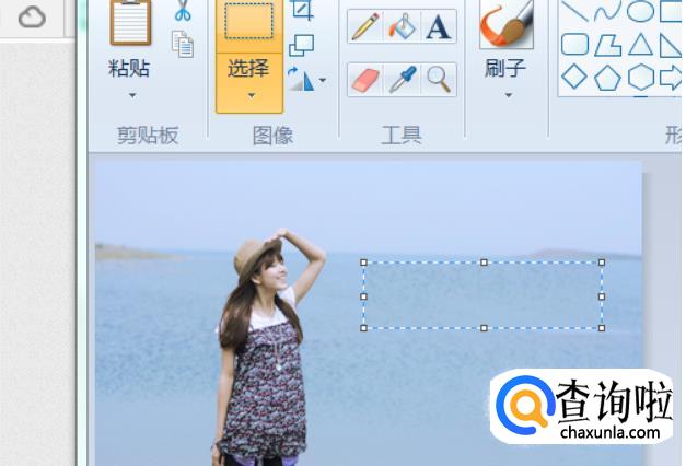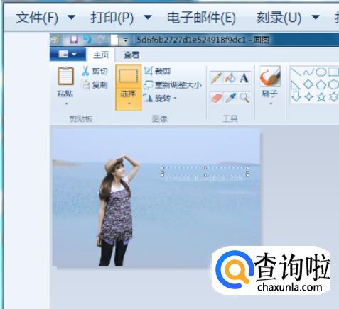 然后点击左上角主页下面一个带有虚线的“长方型”,这时候滑动鼠标到图片的空白处,用已经有“十字”图标的鼠标,在与水印尺寸大小差不多,色差几本相同的地方画个“长方型”。