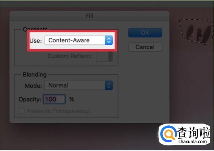 从“使用”下拉菜单中选择“内容识别”(Content Aware),然后点击“确定”。Photoshop程序会用水印周围的混合色来填充涂掉的水印部分。这样我们就去掉水印了。