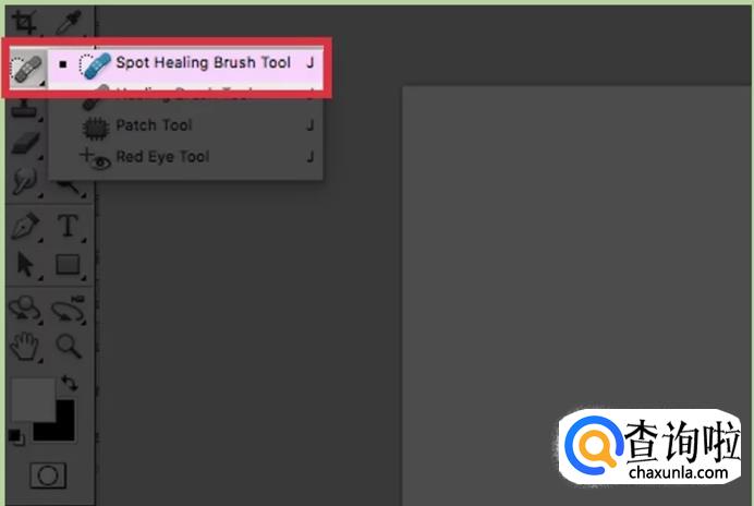从左侧工具栏中选择“污点修复画笔工具“。图标看上去像是在一个白色斑点上贴着一个绷带。