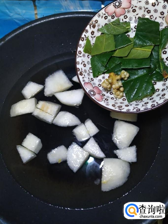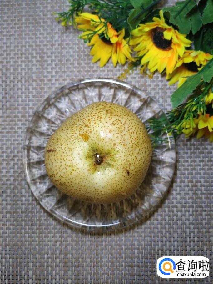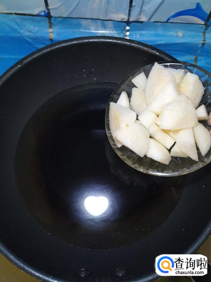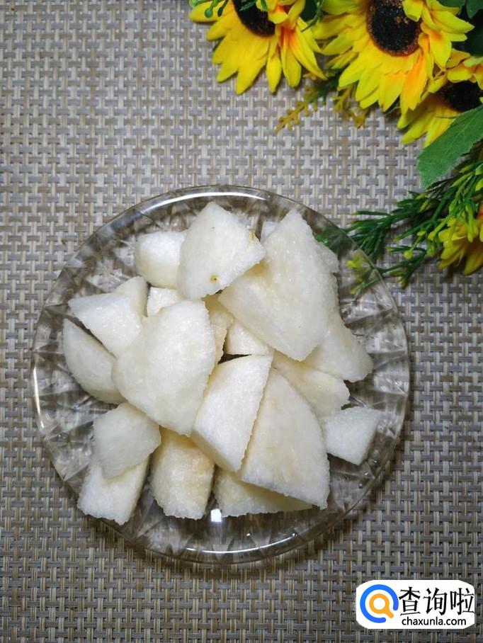准备一个雪梨,这个是砀山梨,去除外皮,切成块,放入盘中备用,这种梨的水分是比较多的,而且营养非常容易进入到汤中。