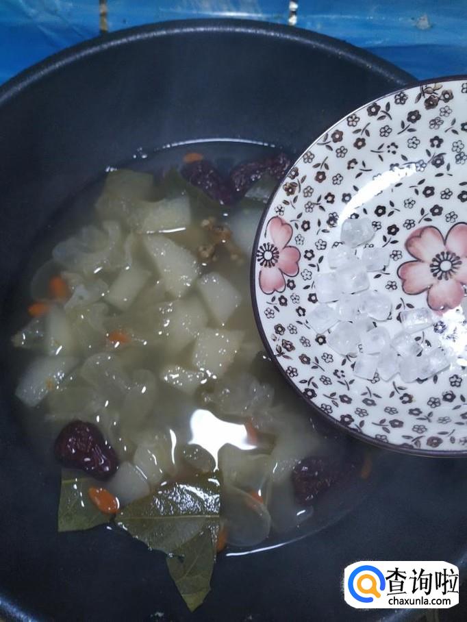 盖上锅盖,大火将水烧开,水开后转小火,煮30分钟左右,出锅前加入适量冰糖调味。