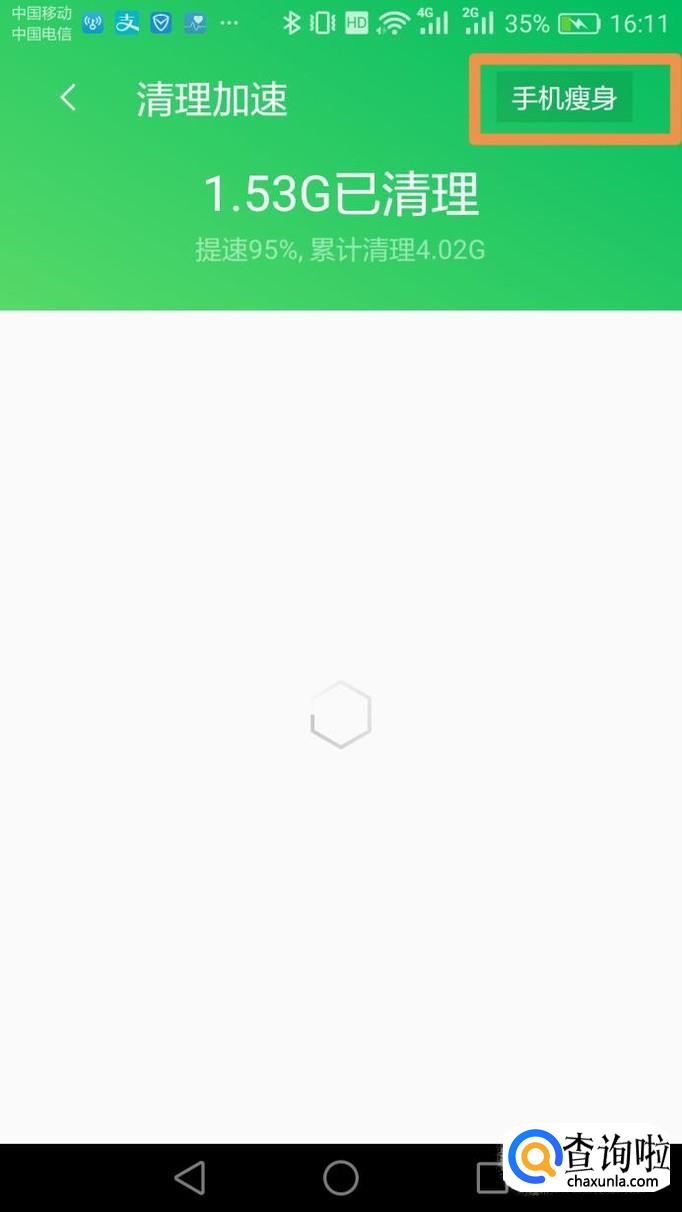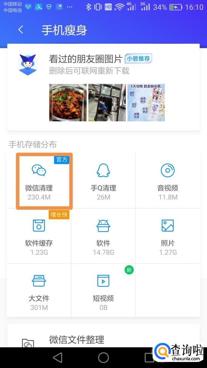 清理完扫描的垃圾数据后,还需要对手机进行进一步的清理加速,可以点击页面右上角的“手机瘦身”,对占用手机内存并且影响网速的的所有无用内容进行清理,比如点击“微信清理”可以对聊天语音、图片、软件自动下载的视频文件等进行清理。深度清理出一定内存后,手机的上网速度会明显加快。