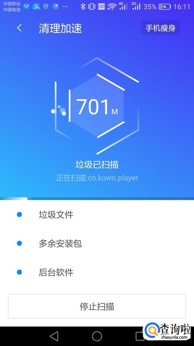 接下来手机管家就会自动帮你将手机内产生的占用手机内存的垃圾文件扫描出来。