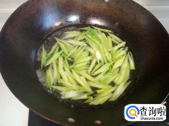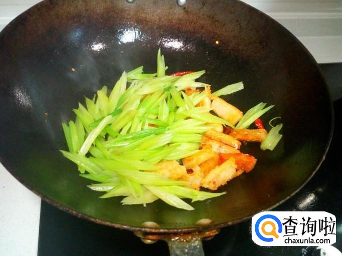 葱,姜,蒜,炒出香味,随即放入煎好的鳗鱼干,放入料酒,略翻炒一下,然后放入芹菜大火爆炒,放少许盐。