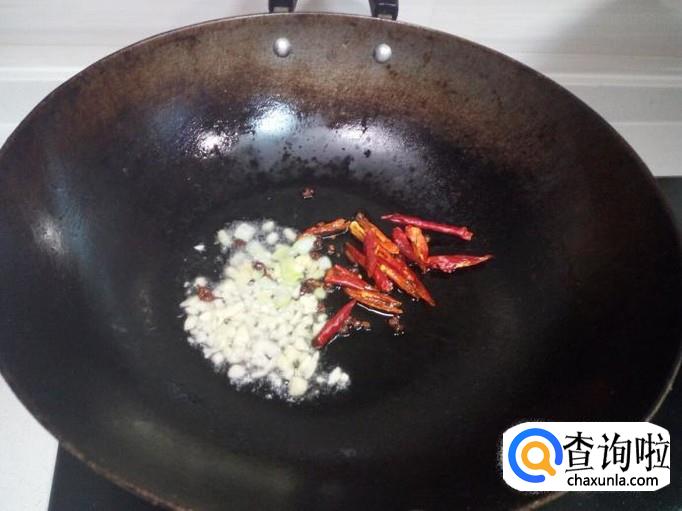 锅内放入油加热,油热后,放入花椒,红干椒爆香,然后放入葱,姜,蒜翻炒。