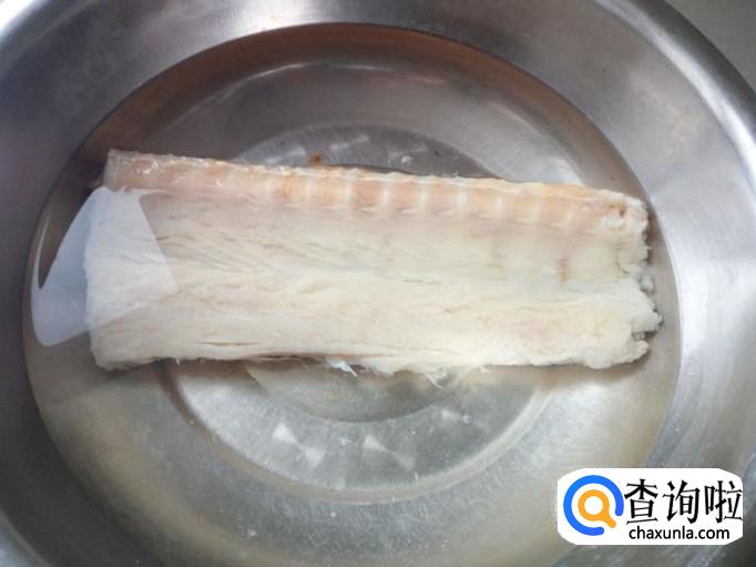 鳗鱼干用水浸泡半天,(如果不喜欢咸,泡的时间要久一些)中途要换几次水。把泡好的鳗鱼干,用水冲洗干净,控干水分,切成小段(去皮和鱼翅)。